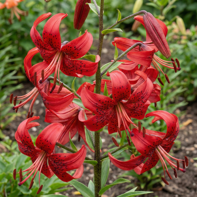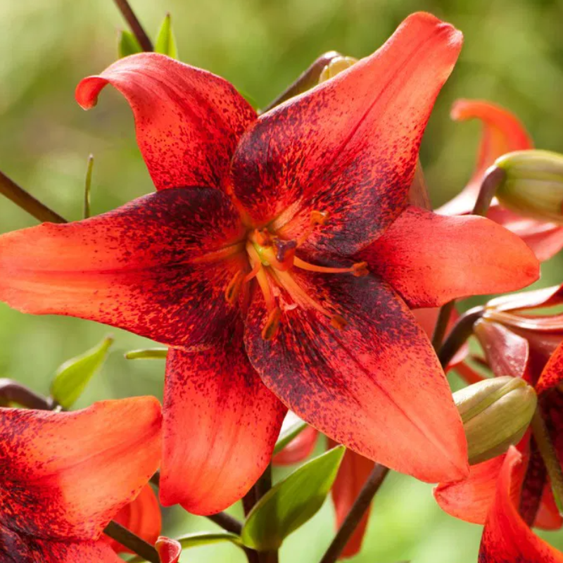 Exotic și rustic în același timp: Crinul Strawberry Event. Petale roșu-căpșună cu pistrui mari, negri, oferind un aspect tigrat unic. Calibru 18/20 pentru un decor plin de personalitate.