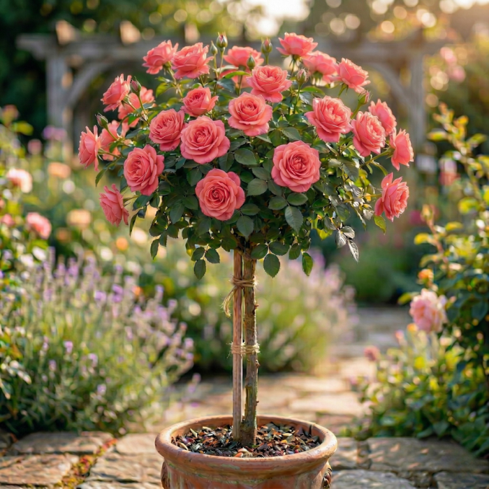 Trandafirul Copac Roz este alegerea clasică pentru un decor elegant și romantic. Coroana sa densă se acoperă cu flori roz (nuanța poate varia ușor în funcție de soiul altoit, de la roz pal la roz ciclamen), oferind un spectacol vizual deosebit. Este extrem de potrivit pentru grădinile formale sau pentru a flanca o bancă de grădină, creând un colț de relaxare parfumat.