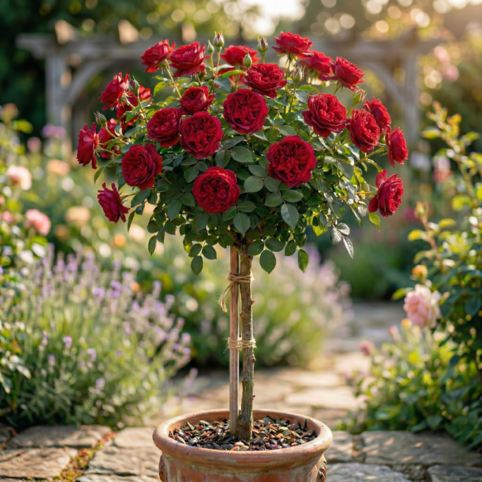 🌹 Floare: Roșu, dimensiuni mari, foarte aspectuoasă.Trandafirul Copac Wielkokwiatowa Roșu impresionează prin dimensiunea florilor. Este un trandafir standard altoit cu un soi de teahibrid cu flori gigantice, roșii. Datorită poziționării la înălțime (pe trunchi de ~1m), aceste flori mari pot fi admirate în toată splendoarea lor fără a te apleca. Este o plantă robustă, cu un impact vizual puternic, potrivită pentru grădini moderne sau clasice.
