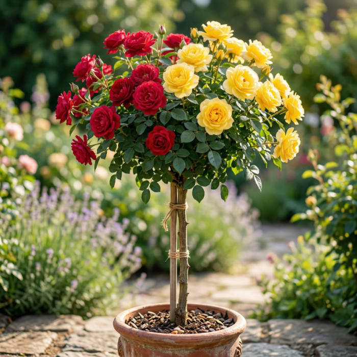 Trandafirul Copac în Două Culori (Mix) aduce diversitate pe o singură tulpină. Prin altoirea a două varietăți distincte (de exemplu, galben cu roșu, sau roz cu alb), se obține un buchet multicolor permanent. Este ideal pentru grădinile mici unde spațiul nu permite plantarea mai multor trandafiri, oferind două culori în locul unuia singur, la înălțimea privirii.